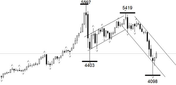 行情方面,黄金在1月29日和3月2日,分别形成两个显著高点5597和5419,高点依次降低,形成典型的双顶/头肩顶结构,预示着未来中长期趋势可能已经由多转空。3月初以来,下跌波段运行于图中通道线内部,本周一K线击穿通道下轨,但在收盘时反弹至通道内部。如果消息面没有突发扰动,未来行情极有可能向通道上轨移动。